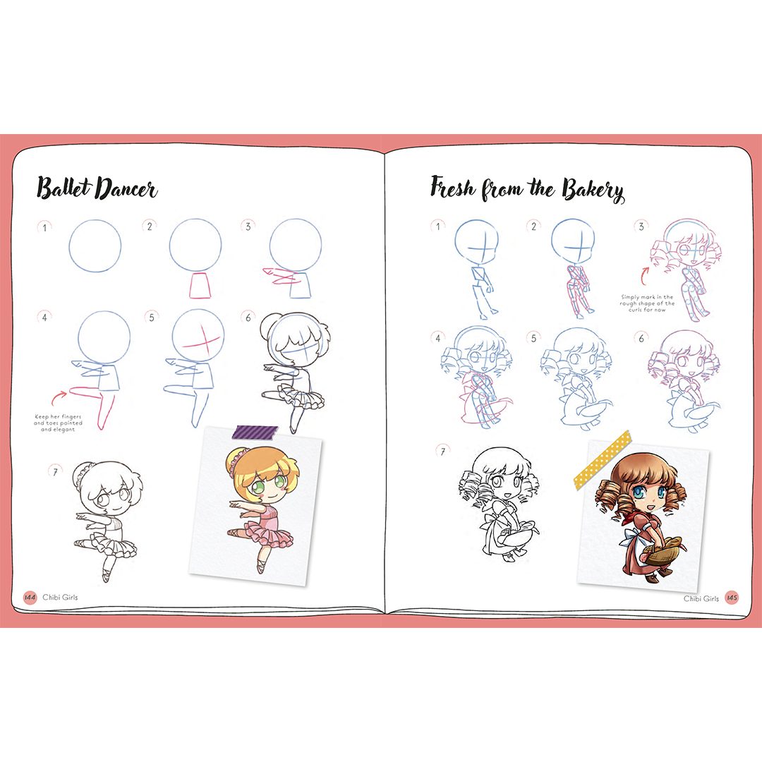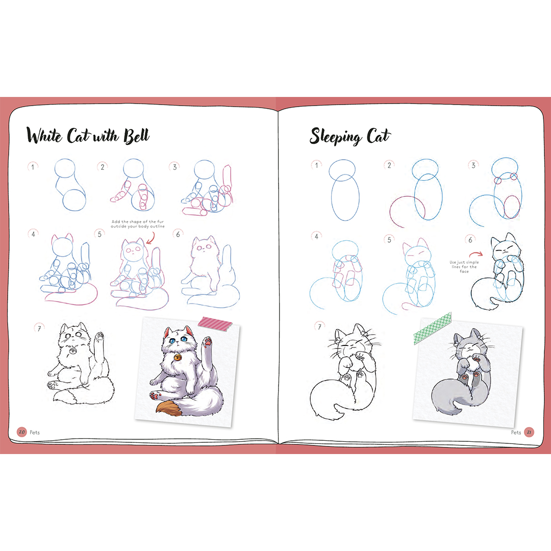 Hvert steg-for-steg-prosjekt er bygget opp i åtte enkle trinn, som starter med en grov skisse av grunnformene og gradvis utvikles til en ferdig, fargelagt tegning.