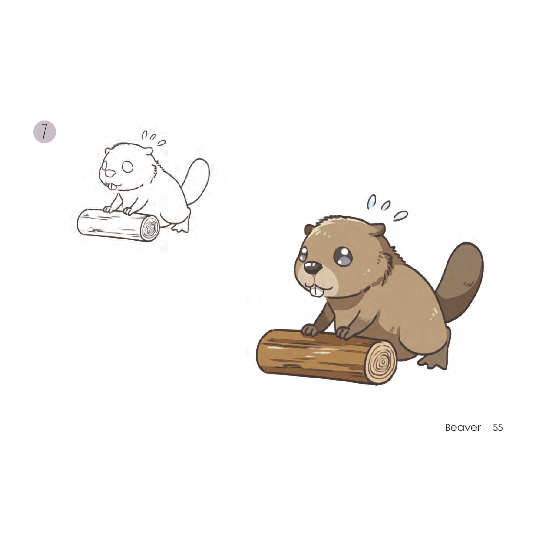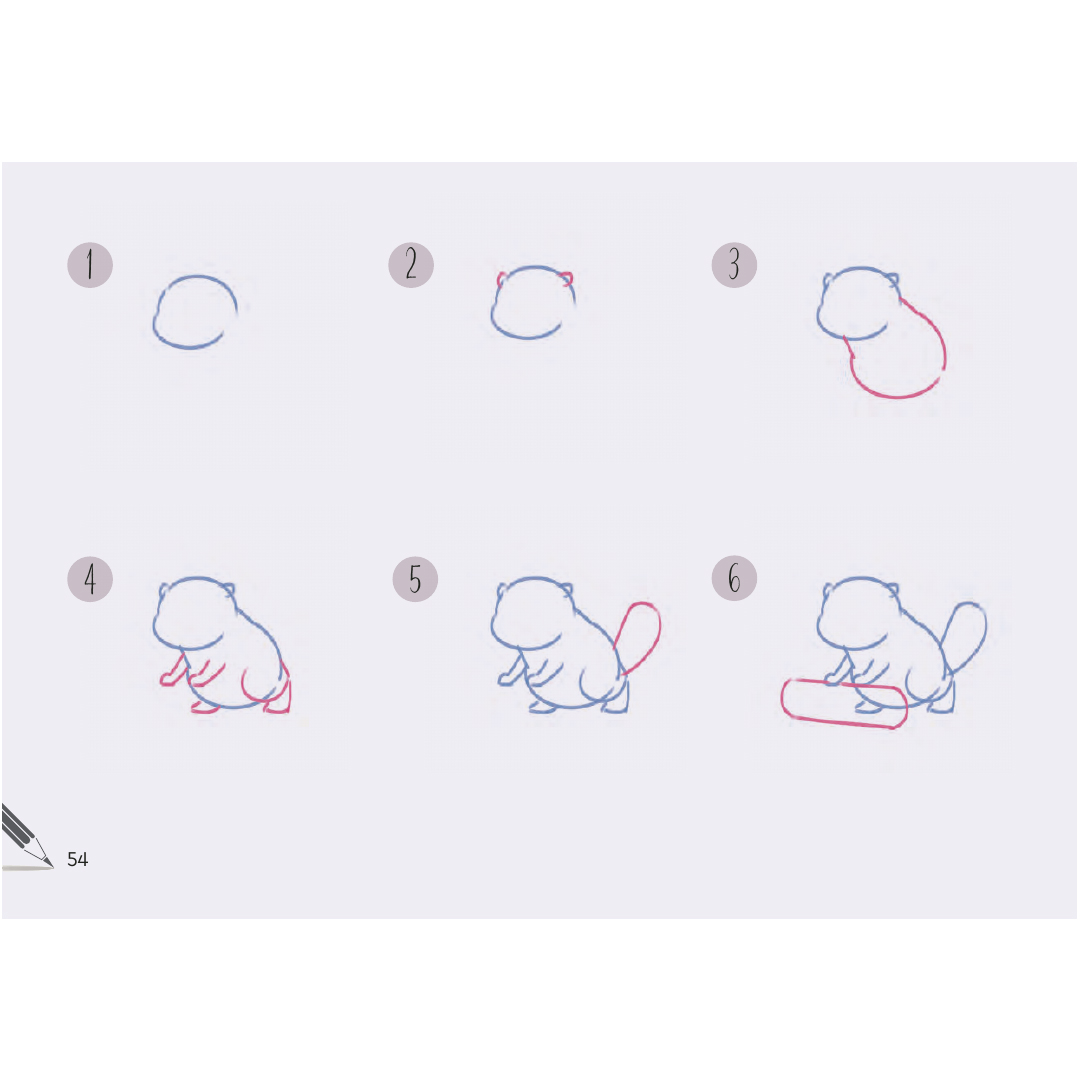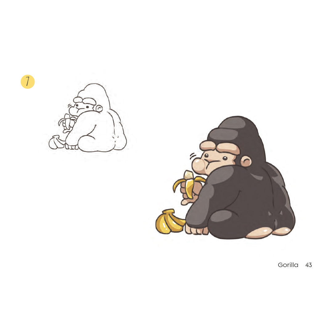 Hvert dyr utvikles i 8 enkle steg, fra en grov skisse av grunnformene til den ferdige, fargelagte tegningen, med en enkel tofargemetode som tydelig viser hvert steg.
