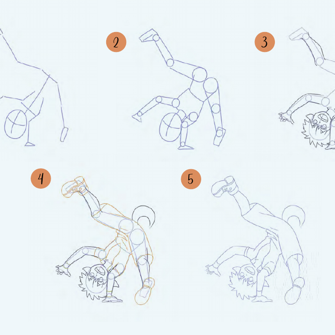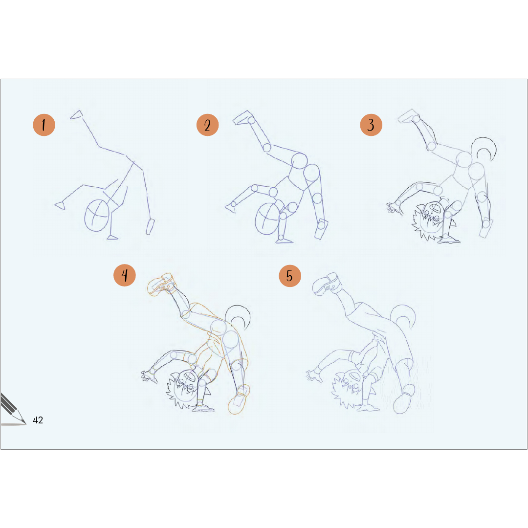 Velg blant et bredt utvalg av figurer, inkludert en trollmann som kaster trylleformler, en flyvende engel, en løpende skolejente og en fargerik popstjerne – i mange dynamiske positurer, alle fulle av personlighet og stil. Hver figur utvikles i åtte enkle trinn, fra en grov skisse med grunnformer til en ferdig, fargelagt tegning, noe som gjør boken egnet for både voksne og barn i alle aldre og på alle nivåer.