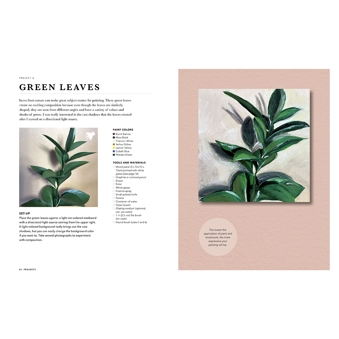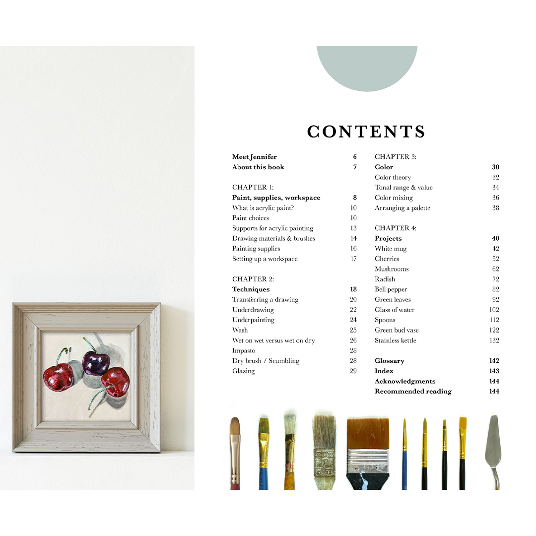 Denne inviterende veiledningen til akrylmaling er laget for å gi nybegynnere selvtillit til å prøve seg på akrylmaling ved å bygge ferdigheter og kunnskap trinn for trinn gjennom ti små stilleben. Den er spesielt tilpasset nybegynnere: trinnene er delt opp på en tydelig og lettfattelig måte som kan brukes i fremtidige malerier – og den inneholder sporbare konturer slik at du kan begynne å male med én gang!