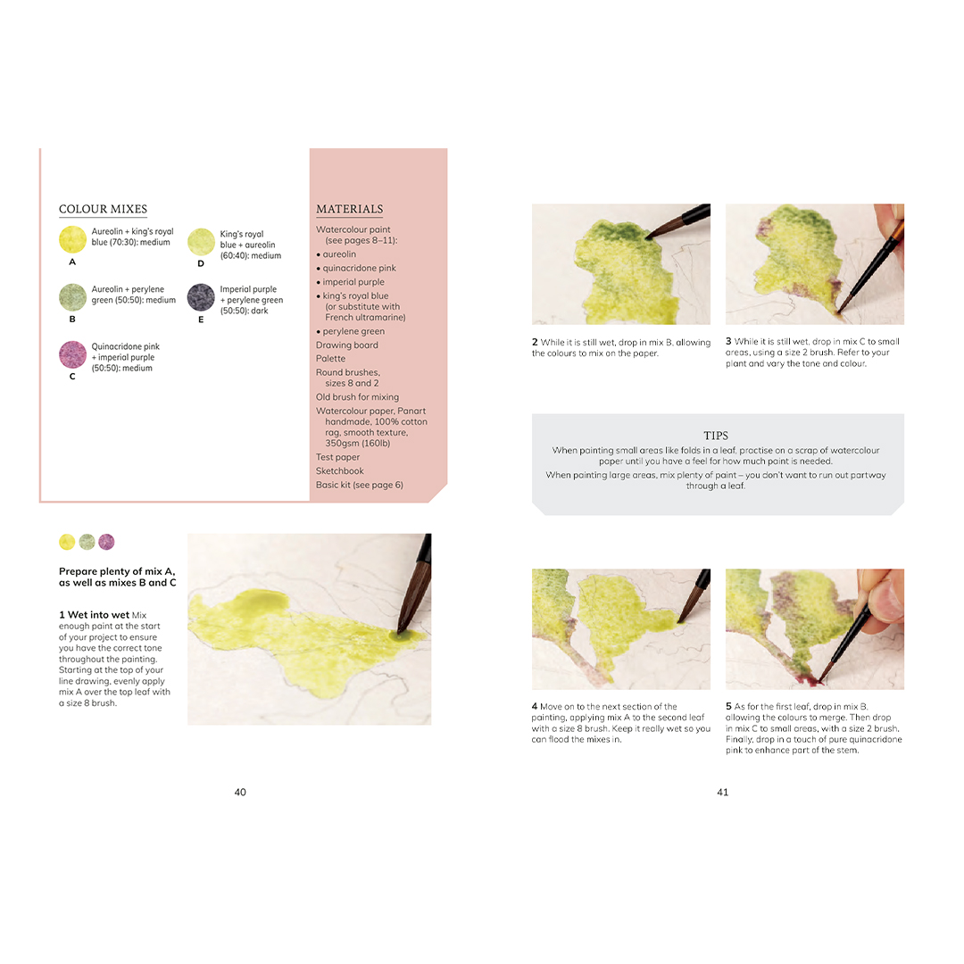 - 15 inspirerende malerier med fargeprøver, hvorav 5 vises trinn for trinn fra start til slutt;