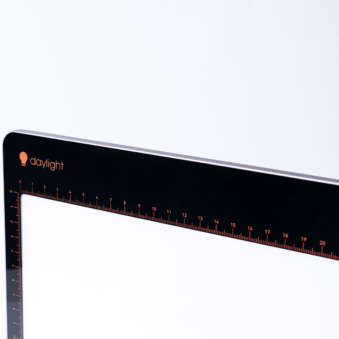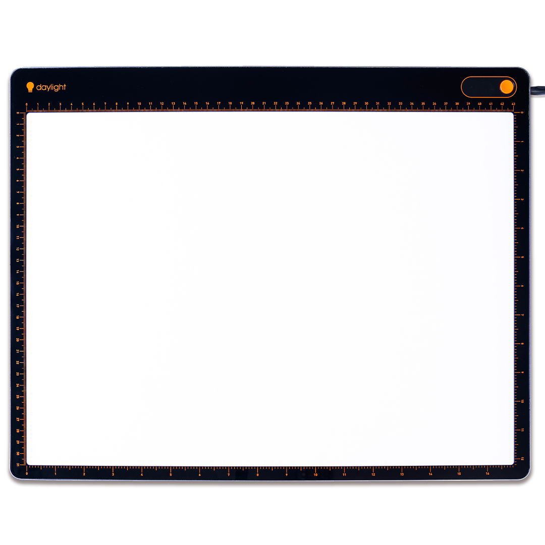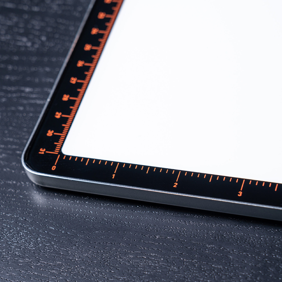 Den praktiske tretrinns dimmeren lar deg enkelt justere lysstyrken etter tykkelsen på papir eller materiale. For ekstra presisjon tilbyr Tabla XL en linjert kant med både centimeter- og tommeskalaer, perfekt for nøyaktige målinger og sporing.