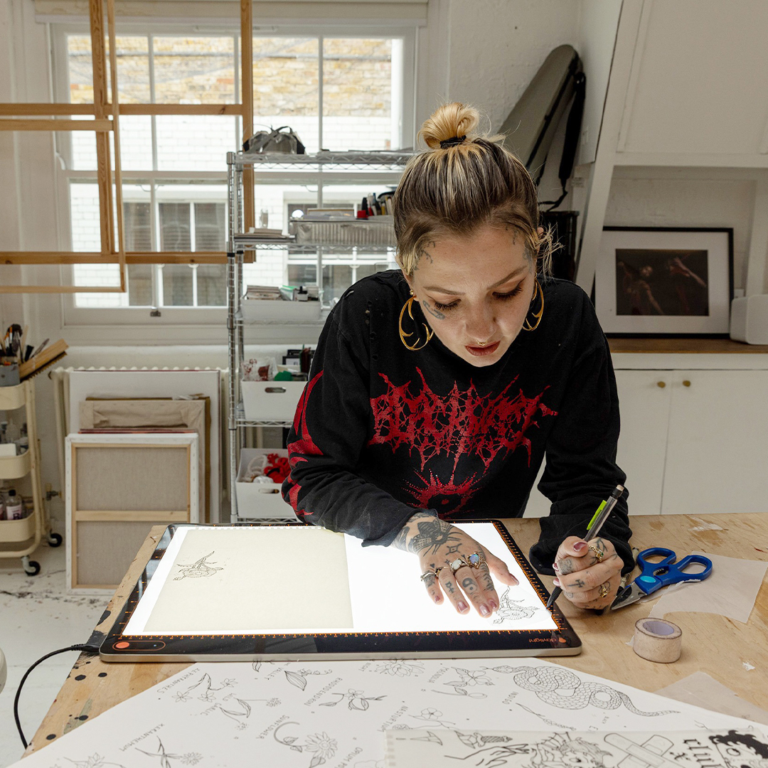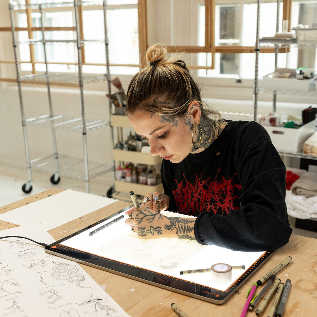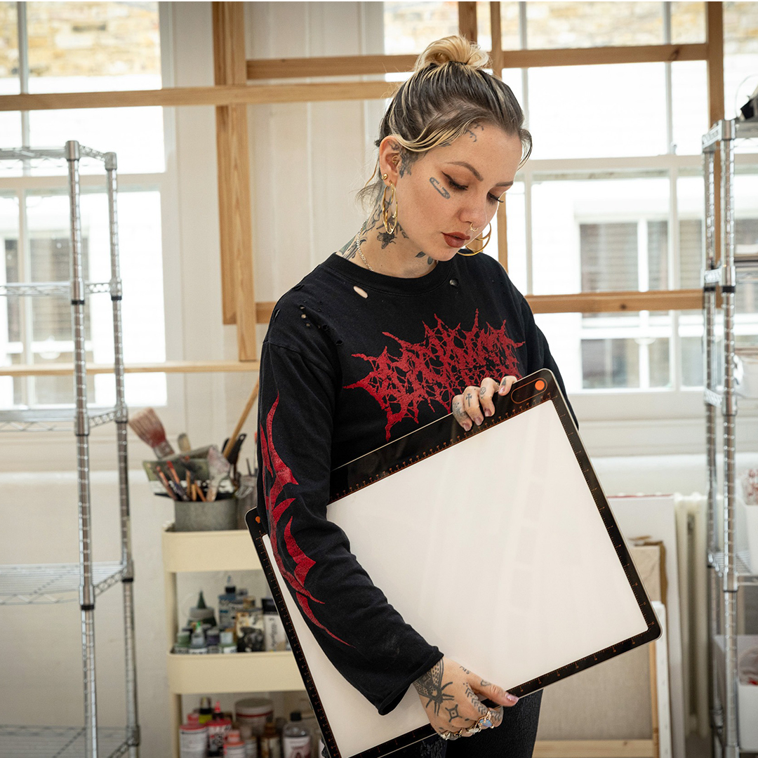 Den praktiske tretrinns dimmeren lar deg enkelt justere lysstyrken etter tykkelsen på papir eller materiale. For ekstra presisjon tilbyr Tabla XL en linjert kant med både centimeter- og tommeskalaer, perfekt for nøyaktige målinger og sporing.