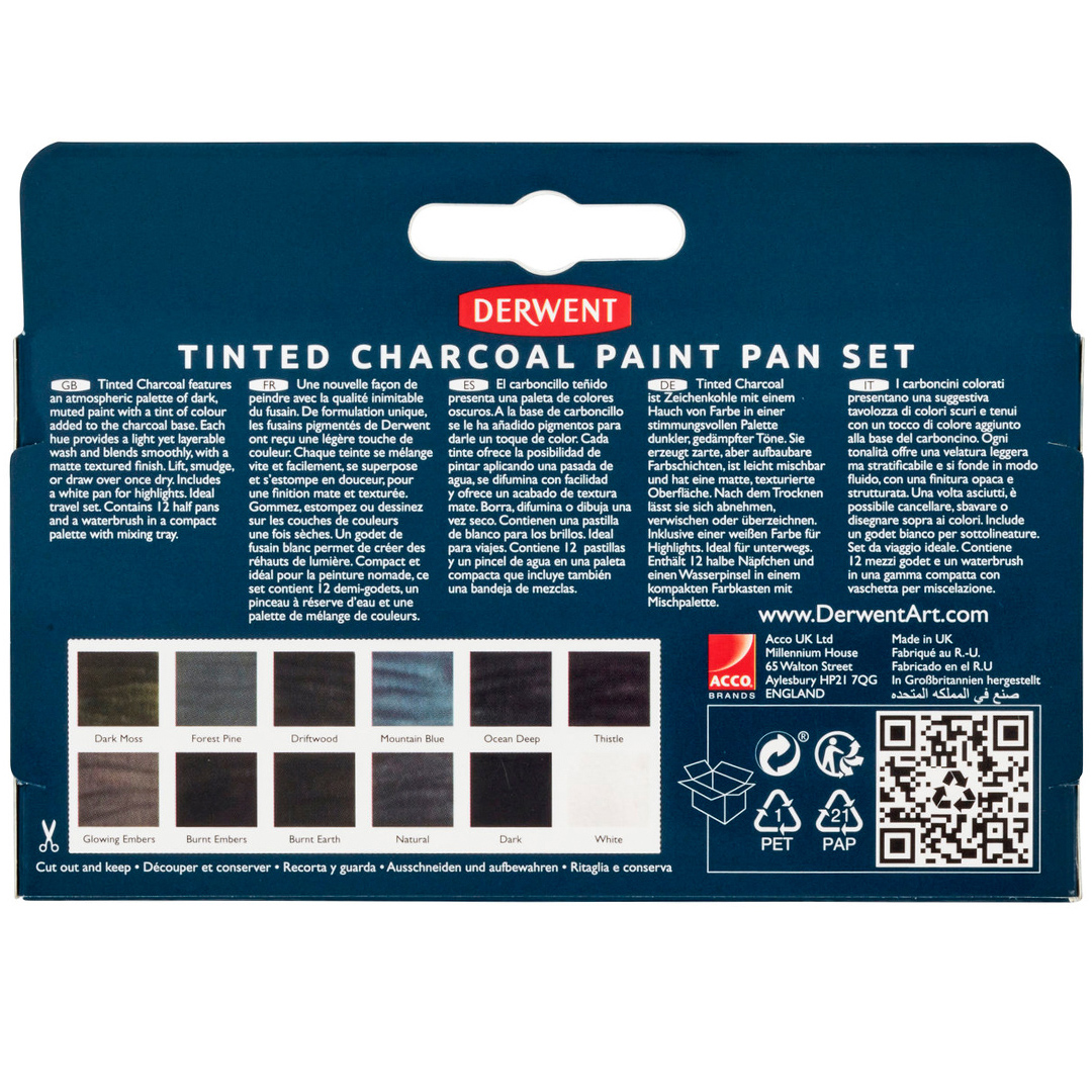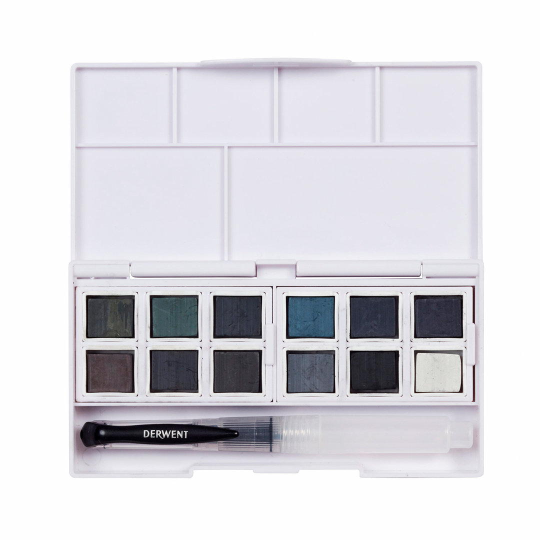 Dette settet har en spesiell formel med vannløselige kullfarger. Her får du 12 mørke og dempede nyanser og en hvit for highlighting. Du kan skape både fargerike toner og transparente overganger. Fargene er matte og har et lett fargestikk sammen med kullens karakteristiske uttrykk, noe som gir fantastisk dybde og rom i tegningen. Fargene er enkle å påføre våte og blander seg lett med hverandre.