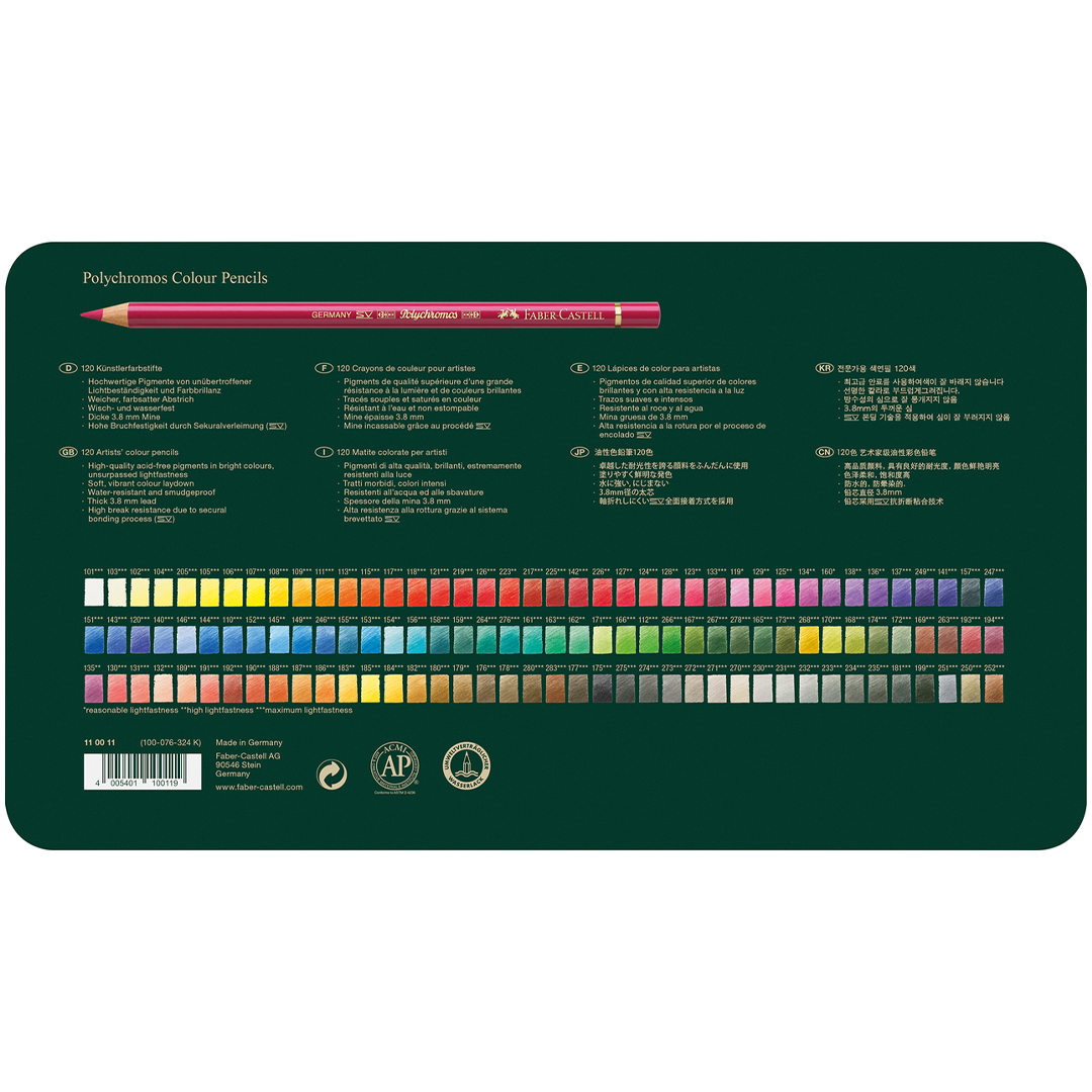 Med høykvalitets, syrefrie pigmenter leverer Polychromos en uslåelig lysekthet som bevarer fargenes briljans i tiår, kombinert med maksimal bruddmotstand, smitte- og vannresistens samt eksepsjonelle tegneegenskaper.