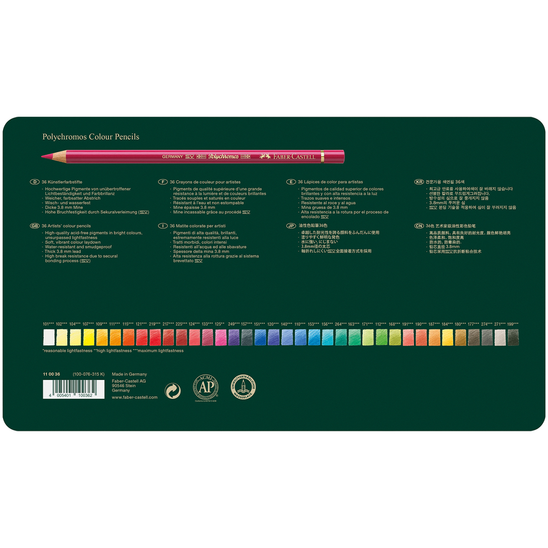Med høykvalitets, syrefrie pigmenter leverer Polychromos en uslåelig lysekthet som bevarer fargenes briljans i tiår, kombinert med maksimal bruddmotstand, smitte- og vannresistens samt eksepsjonelle tegneegenskaper.