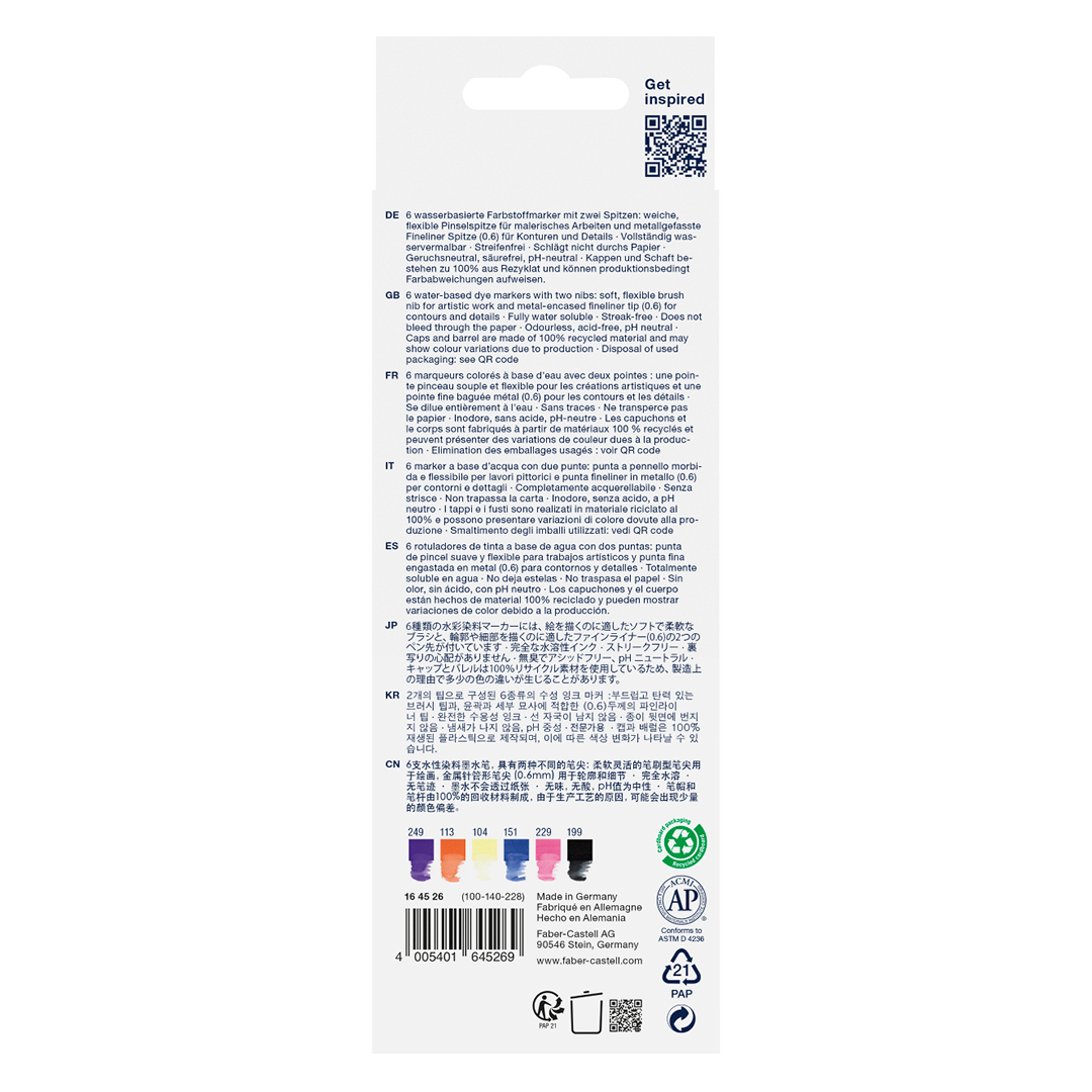 Aqua Dual Marker er en smal detaljrik spiss sammen med en fleksibel penselspiss. Den ultimate komboen for å lage skisser, konturer, skape lettering og benytte til fargelegging. Blekket er vannbasert, noe som betyr at det ikke blør igjennom papiret, og vannløselig, noe som gjør at det kan benyttes til å lage akvarell-effekter på papir.