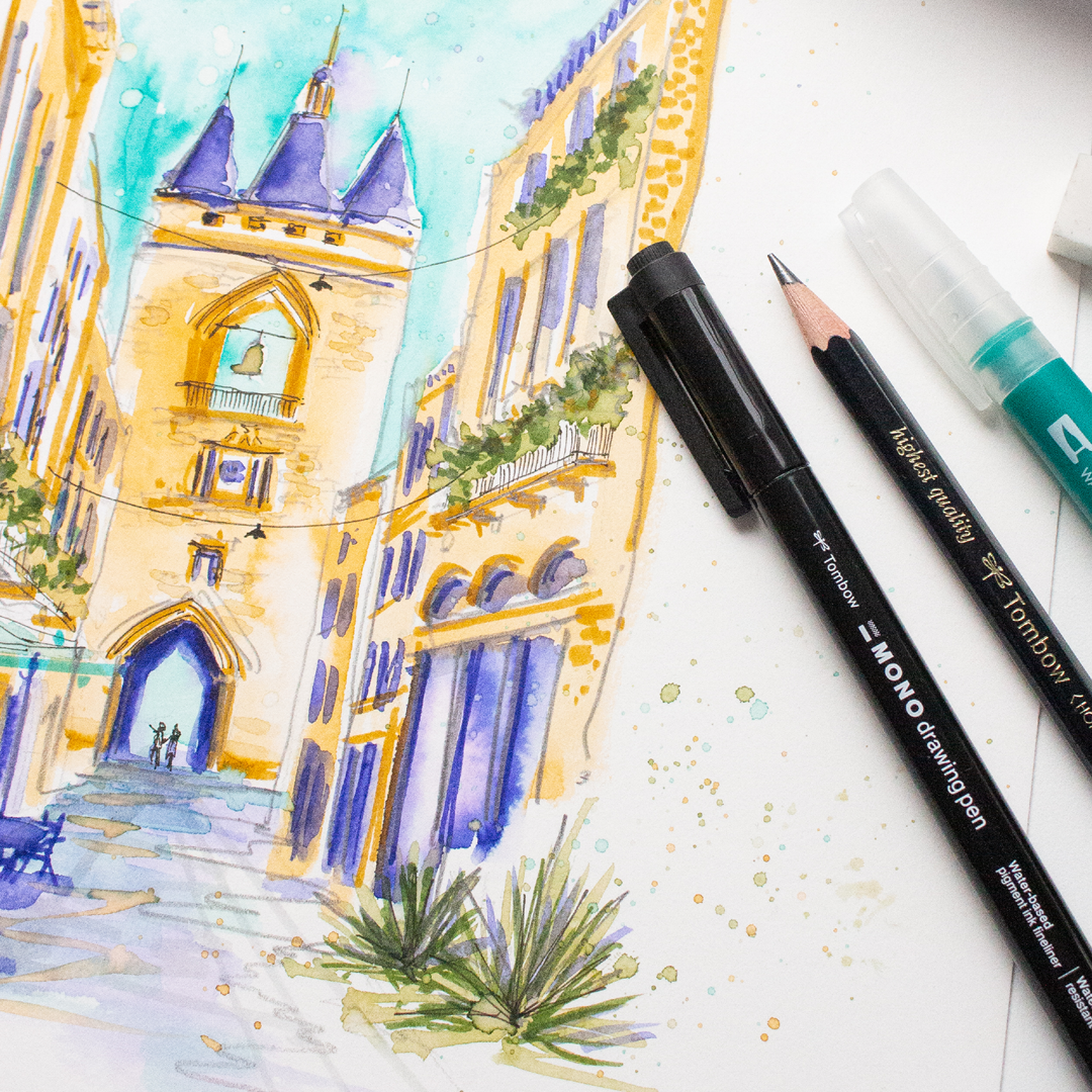 Husk at det ikke finnes noen regler for hvilke materialer du skal bruke i urban sketching. Selv om blekk og akvarell er vanlige alternativer, er det mange som like gjerne pakker ned fargeblyanter, kritt eller andre favoritter. Det viktigste er at du bruker noe du trives med og som gjør det enkelt å faktisk komme i gang.