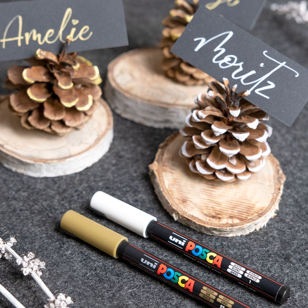 Gi bordkortene dine et grafisk preg ved hjelp av akrylmarker! Lek deg og kombiner med alle typer penner du har hjemme. Bland finelinere med akrylmarker og gelpenner. Fordelen med penner er at de er enkle å jobbe med, og tørker raskt, perfekt både for raske idéer og mer detaljerte motiver. Ambisjonsnivået bestemmer du selv. Det fine er at du kan lage stilige bordkort på bare noen få minutter!