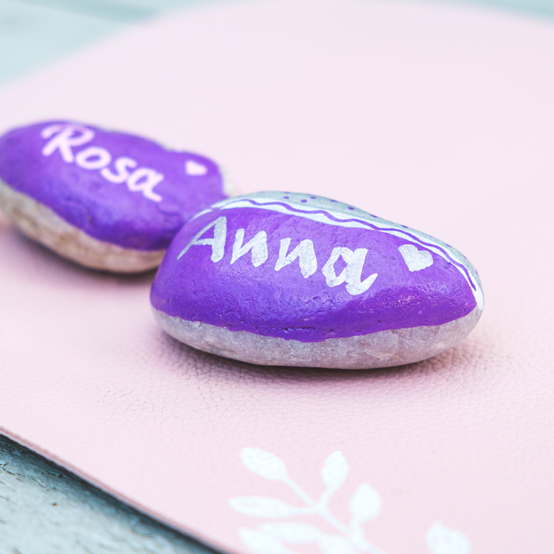 - Mal eller tegn direkte på materialet med akrylmaling eller akrylmarker. På glatte overflater kan du skrive gjestens navn direkte, men på ujevne former kan du heller fokusere på farge og effekt med gullkanter eller ulike mønstre.