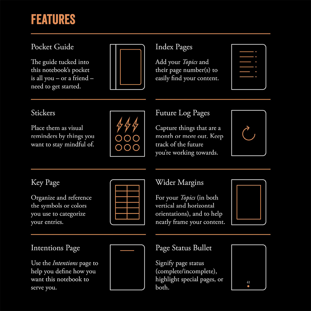 Boken har 206 nummererte sider med prikket (dotted) layout. Papirets tykkelse (120 g/m²) og høye kvalitet forhindrer gjennomblødning (ink-proof). A5-formatet gir rikelig med plass til planlegging, lister, kreative skisser og daglige notater. Tre bokmerker i forskjellige farger gjør det lett å finne dine ulike seksjoner.