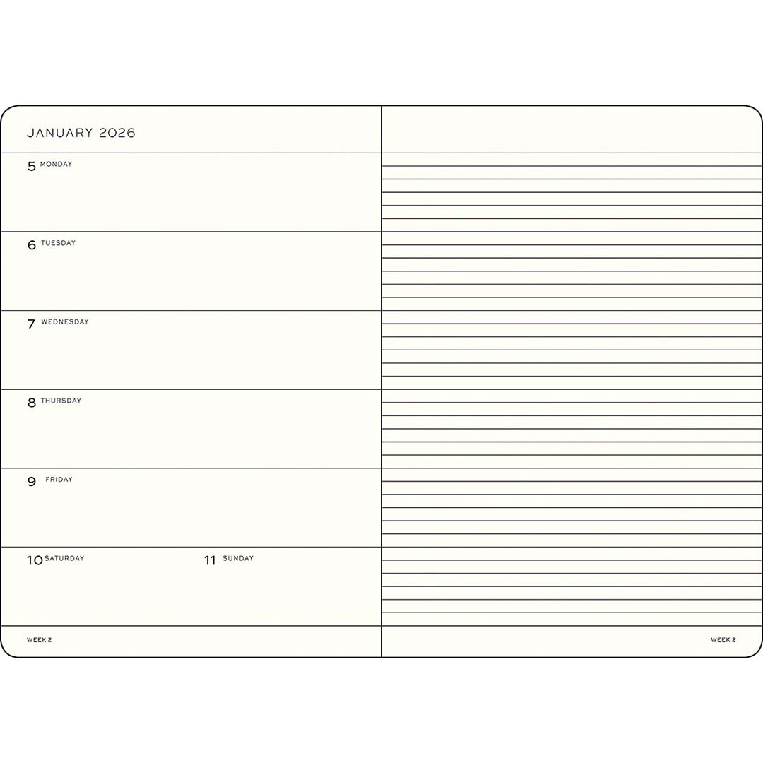 Planlegg året ditt med en kalender fra Leuchtturm1917 i A5-format med mykt omslag. “Weekly Planner and Notebook” har ukeoversikt på venstre side og plass til notater på høyre side. Layouten gir rikelig med plass til planlegging, organisering og notater.