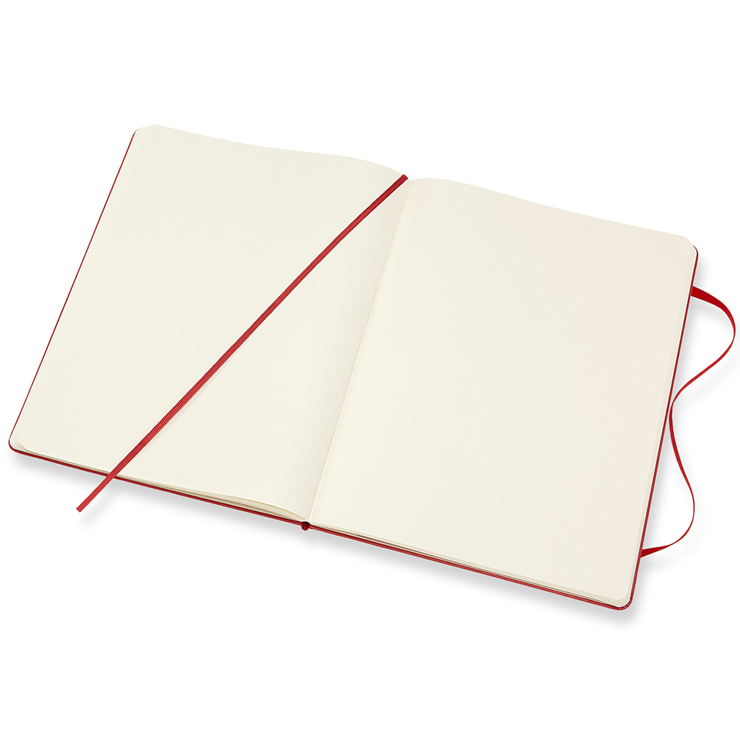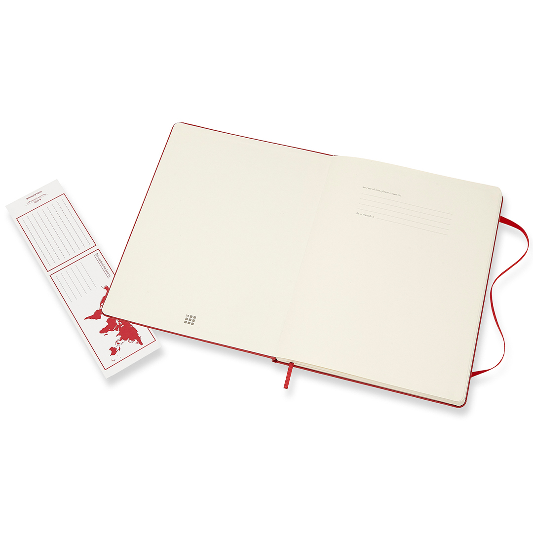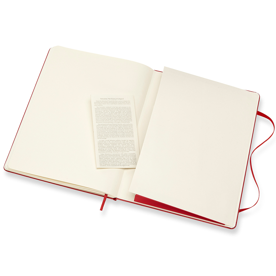Notatbok med hardt omslag i XL-størrelse (19 × 25 cm) fra italienske Moleskine. Notatboken inneholder 192 sider og har en utvidbar innerlomme samt et elastisk bånd som holder boken lukket når den ikke er i bruk. Det elfenbensfargede papiret er FSC-sertifisert, syrefritt og av høy kvalitet!