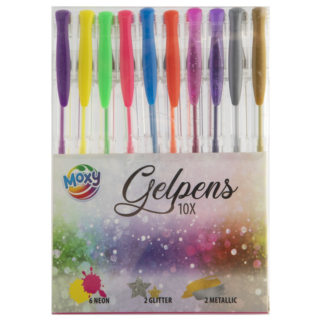 En pakke med 10 forskjellige farger gelpenner i ulike farger! Pakken inneholder neonfarger, glitter og metalliske farger. Moro å både fargelegge og skrive med da de skriver så mykt. La kreativiteten din skinne med disse gelpennene, perfekt å ta med seg på reise takket være emballasjen!
