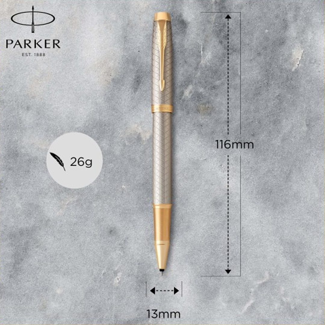 I over 130 år har Parker laget penner og forfinet teknikkene sine for å kunne tilby skriveinstrumenter i topp kvalitet. IM Premium er intet unntak. Dette er en profesjonell og, ikke minst vakker penn, som kombinerer en elegant, avsmalnende form med ikoniske detaljer. Pennen er laget av messing, og har en kulespiss som gir jevne linjer og en myk skriveopplevelse. Det som får IM Premium til å skille seg ut er det graverte mønsteret på pennens kropp. Dette er prikken over i-en på en penn som passer like bra som gave til andre som til deg selv. Glanset lakk i varm sølvfarge med gravert diamantformet mønster og detaljer i gullplett. Fylles på med Parkers egen rollerball-refill. Leveres i enkel gaveeske med én patron. Denne varianten finnes også som reservoar- og kulespisspenn.