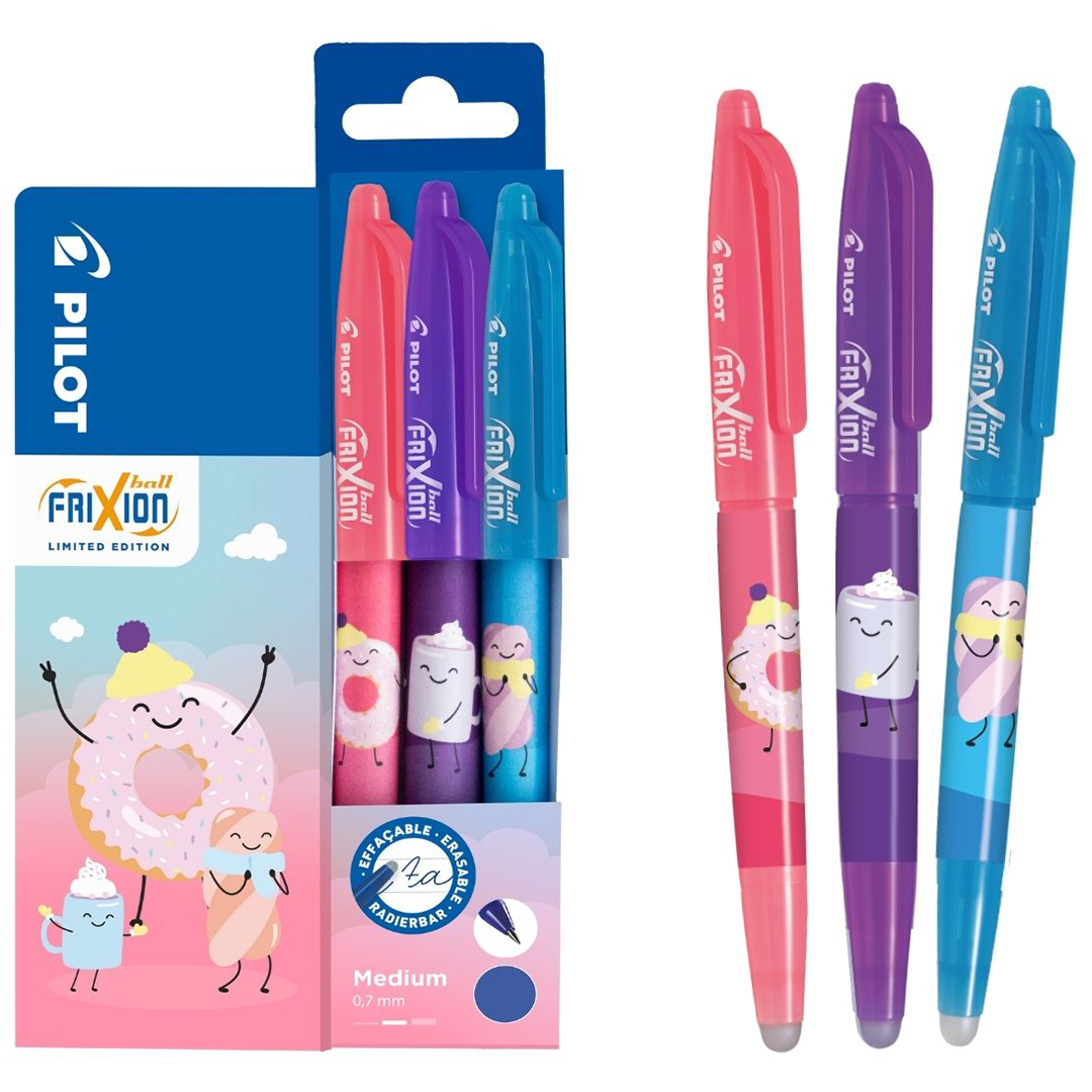 Winter Sweet Collection FriXion Ball består av et sett med tre unike penner designet med lekne karakterer: Dizzy Donut (energisk og leken), Choco Hug (rolig og omsorgsfull) og Fluffy Mallow (myk og koselig). Denne begrensede utgaven passer utmerket til å gjøre skrivingen varm og kreativ selv i kalde vinterdager.