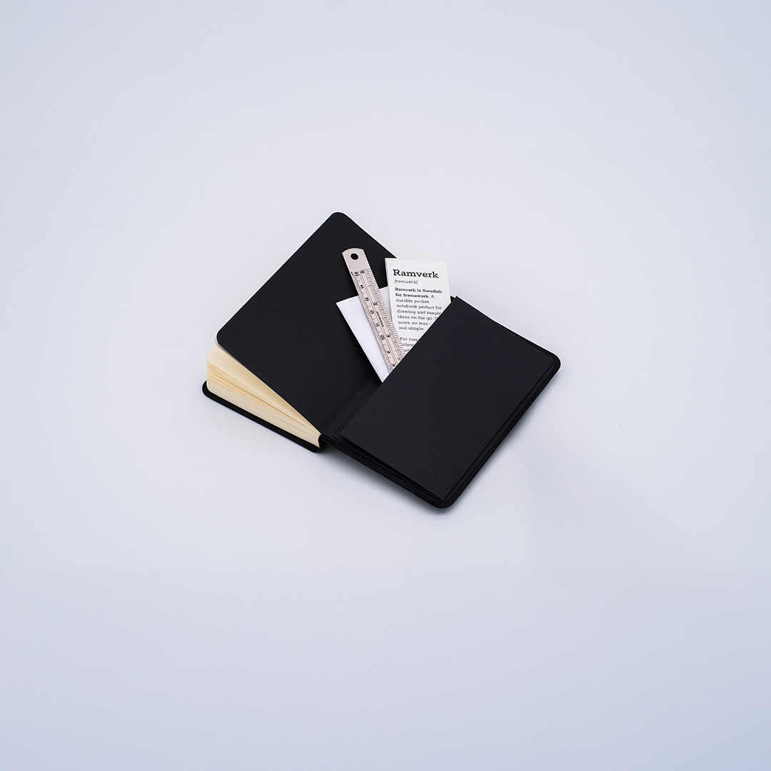 Omslaget er laget av vegansk lær med en rygg av hampestoff. Boken er trådheftet, noe som gjør at den kan ligge flatt når du skriver eller skisserer. Bakerst i boken finnes en praktisk lomme for løse ark eller notater. Den har også et elastisk bånd som holder boken lukket og beskytter sidene når den ikke brukes.