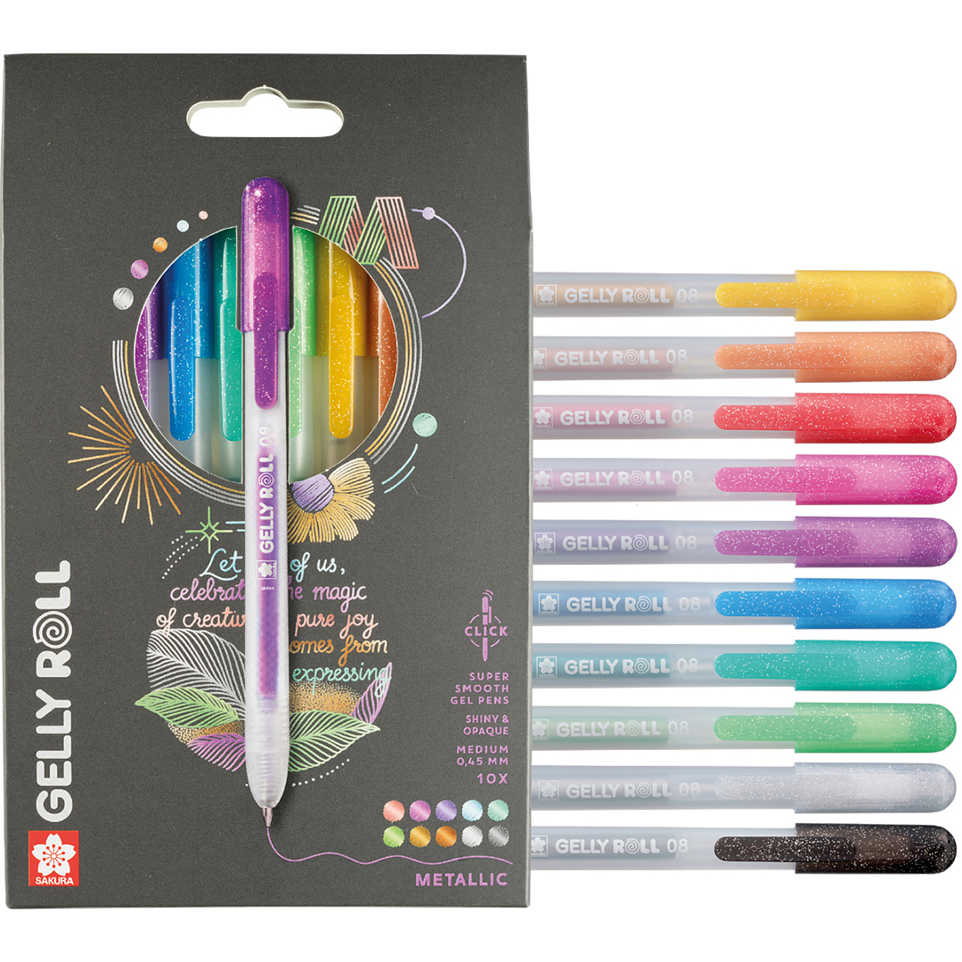Pakken inneholder 10 klikkbare gelpenner i metalliske farger: rød, rosa, lilla, blå, grønn, smaragd, gull, sølv, kobber og svart.