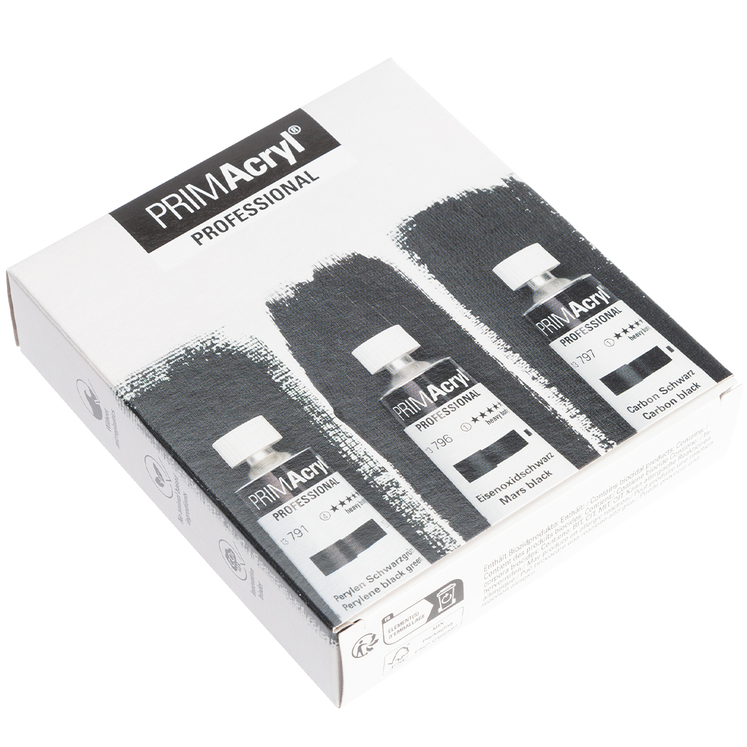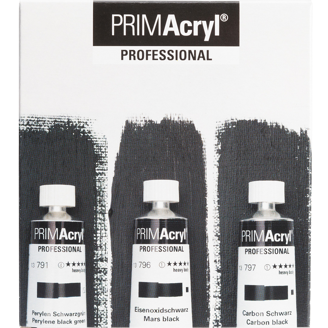 Settet inneholder 3 tuber à 35 ml PRIMAcryl Professional-farger: Perylene Black Green, Mars Black, Carbon Black.