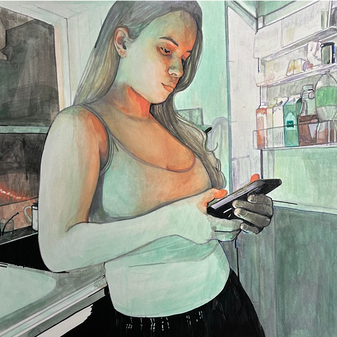 Verket utforsker vårt forhold til skjermen og hvordan den inviterer til distraksjon. Jeg ønsket å skildre hvordan vi noen ganger blir sittende fast i den, men også hvordan den kan tilby et øyeblikk av ro og avskjerming midt i hverdagens støy. Det var også en spennende utfordring å fange lyset fra skjermen og kjøleskapet i det mørke rommet.