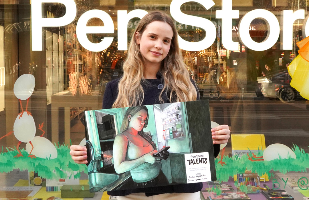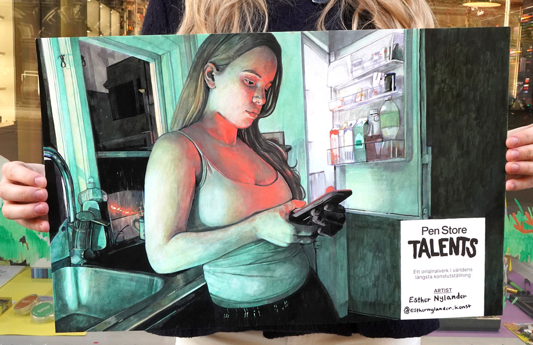 Esther Nylander er en av årets deltakere i Pen Store Talents, en kreativ utfordring der du, med åtte utvalgte penner og et forhåndsbestemt underlag, skal skape et originalverk uten andre verktøy eller snarveier. Årets bidrag blir dessuten en del av verdens lengste kunstutstilling når tusenvis av verk vises i Stockholms T-bane.