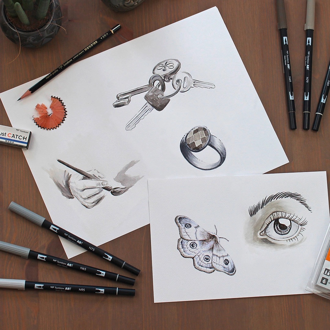 Tombow ABT er vannbaserte og luktfrie, giftfrie og syrefrie. De fungerer akkurat som akvarellfarger og smelter uanstrengt sammen.