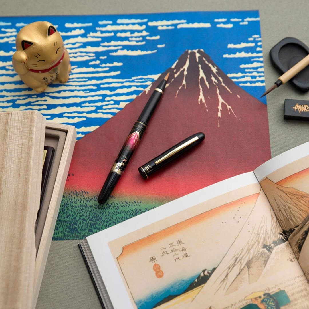 Kuretake Mannen Mouhitsu «Makie-Monogatari» er en luksuriøs serie påfyllbare penselpenner med tradisjonell japansk design inspirert av maki-e, den utsøkte lakkunstformen der gull- og sølvpulver påføres i tynne lag for skimrende, dyprodlige mønstre på mørke overflater. Pulveret består av ultrafine flak eller granulater fra bladgull/sølv som påføres i lakk og poleres for skimrende effekt.