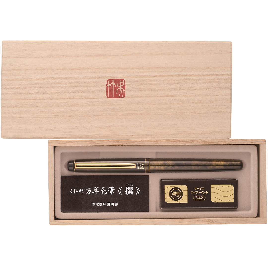 Kuretake Mannen Mouhitsu "Sen Bekkou-cho" er en etterfyllbar premium-penselpenn med elegant design inspirert av tradisjonell japansk estetikk. Den har en syntetisk penselspiss av elastiske polyesterbørstehår som gir eksepsjonell fleksibilitet for linjevarijoner fra veldig tynne til brede streker.